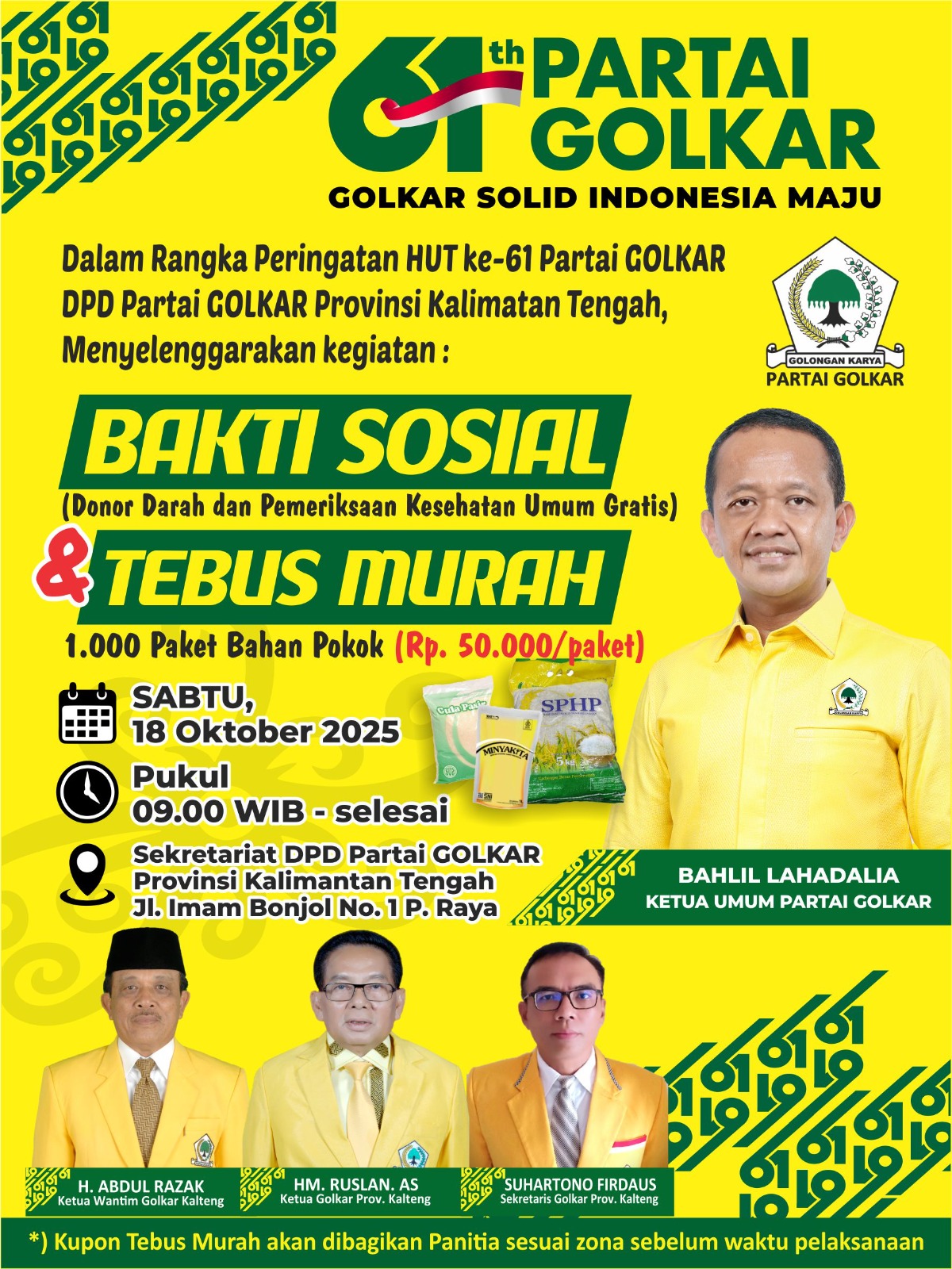 Lebih lanjut, Siti Nafsiah menjelaskan bahwa kupon tebus murah dapat diambil di Kantor DPD Golkar Kalteng mulai Rabu (15/10/2025).
